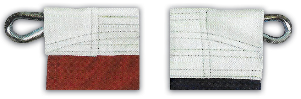 8′ X 12′ and larger American flags include plated steel rope thimbles. Thimbles are attached to white rope using a triple crimped rope sleeve. The length of the rope is sewn into the header to stabilize its position and prevent bunching.